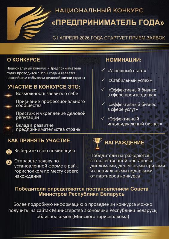 В соответствии с постановлением Совета Министров Республики Беларусь от 17 марта 2016 г. № 207 «О Национальном конкурсе «Предприниматель года», Министерство экономики объявляет о старте с 1 апреля 2026 г. Национального конкурса «Предприниматель года».