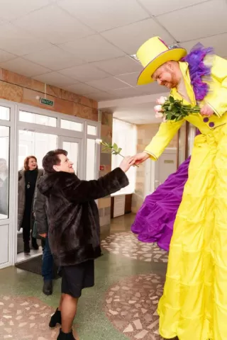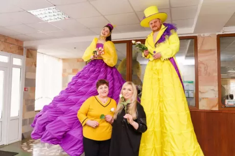 И, конечно, была креативная развлекательная программа, где нашлось место фуршету, фотовыставке, концертным номерам, необычной выставке кукол, «огромным» артистам, которые поздравляли женщин прямо в фойе концертно-спортивного центра.