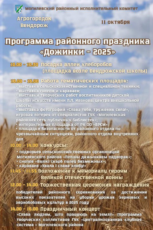 11 октября агрогородок Вендорож станет центром притяжения для жителей и гостей Могилевского района: здесь пройдет районный фестиваль-ярмарка тружеников села «Дажынкi-2025».
