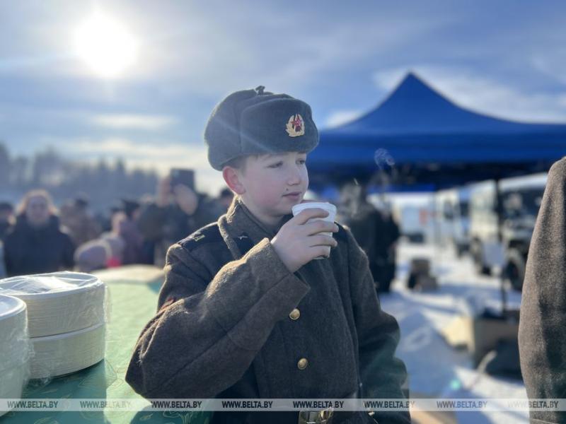 Как же МотоМасленица без вкусных угощений. Всех гостей накормили солдатской кашей. И здесь она действительно вкусная. Очередь была большой, даже за добавкой приходили. Горячий чай и блины. А отвечали за вкусную еду удивительные люди в советской одежде с особым колоритом. С самым юным помощником мы решили познакомиться и узнать для чего они приехали. Максим Парыжник, которому всего 13 лет, приехал сегодня вместе со своим дядей. "Меня дядя всегда зовет вместе с собой поучаствовать в подобных мероприятиях. Мне тоже это интересно, я этим увлекаюсь, такой военной тематикой, - рассказал с энтузиазмом Максим. - Дядя в интернете покупает много военной формы, вся сегодняшняя техника для приготовления еды его".