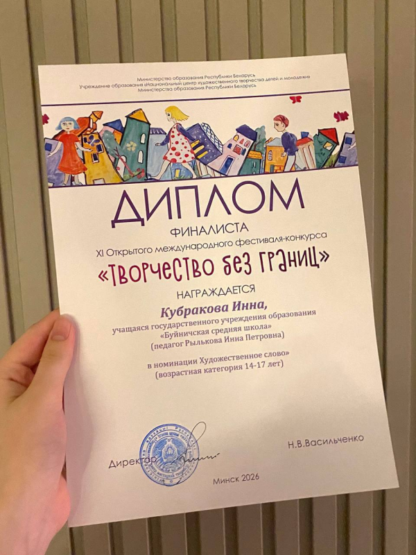 Ученица Буйничской средней школы Инна Кубракова выступила на конкурсе в жанре «Художественное слово» со стихотворением собственного сочинения и была награждена Дипломом финалиста.